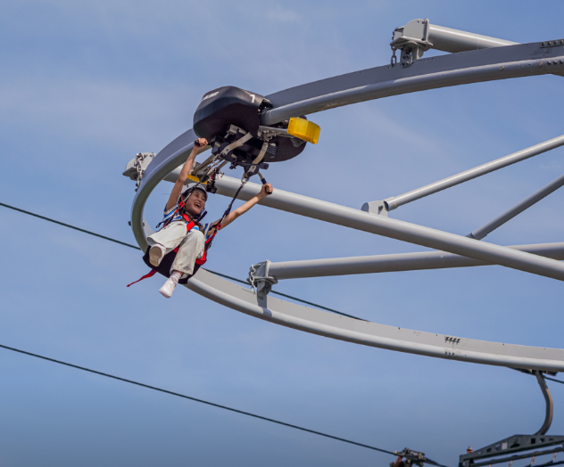 롤 글라이더는 간단히 말하면, 하늘 위에서 즐기는 1인용 롤러코스터입니다. 일반적인 롤러코스터와는 달리 트랙 위에 몸이 매달리는 구조로, 탑승자가 양손으로 손잡이를 잡고 전동 모터의 힘으로 고속 질주하게 됩니다. 건물 6층 높이(약 25m) 위에서 출발해, 해발 215m 지점에서 바다를 향해 내려오는 총 1km 길이의 트랙을 최고 시속 55km로 날아가는 형식이에요.