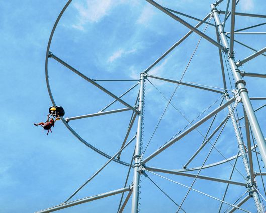 처음 탑승대 위에 섰을 때부터 심장이 쿵쾅쿵쾅… 건물 6층 높이의 고공에서 출발 지점에 몸을 맡기고 매달리는 순간, 긴장이 온몸을 휘감습니다.