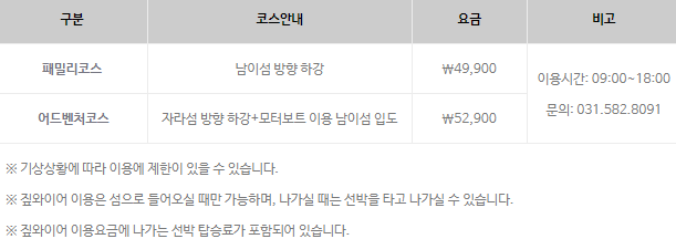 - 남이섬 직행 코스 (패밀리): 49,900원 (1분 30초 소요, 40km/h)