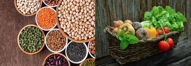 - 채소와 + 콩 : 채소는 다양한 종류의 식이섬유를 함유하고 있습니다. 녹색 잎채소, 브로콜리, 당근 등을 활용하여 다양한 비타민과 식이섬유를 섭취할 수 있습니다. 콩은 단백질 함량이 높아 훌륭한 대체 단백질 원료로 활용 될 수 있습니다. 콩 샐러드나 채소와 함께 조리한 콩 요리를 섭취할 수 있습니다.