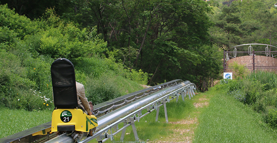 탑승자가 직접 속도를 조절하며 레일 위를 달릴 수 있는 알파인코스터는 남한강을 내려다보며 시원한 바람을 맞을 수 있어 특히 인기 있는 체험입니다.