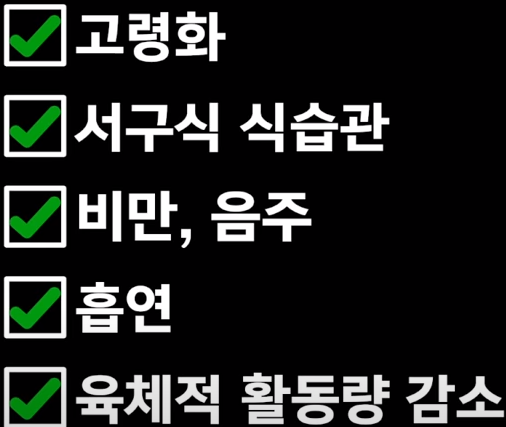 40~50세 이상의 고령화 그리고 육식을 많이 하는 서구화된 식습관, 비만, 음주, 흡연, 운동 부족 등이 대장암의 위험을 증가시킨다는 것으로 알려져 있고 가족력과 같은 유전적 요인과 대장의 염증성 장질환 같은 것들도 위험요인으로 알려져 있습니다.