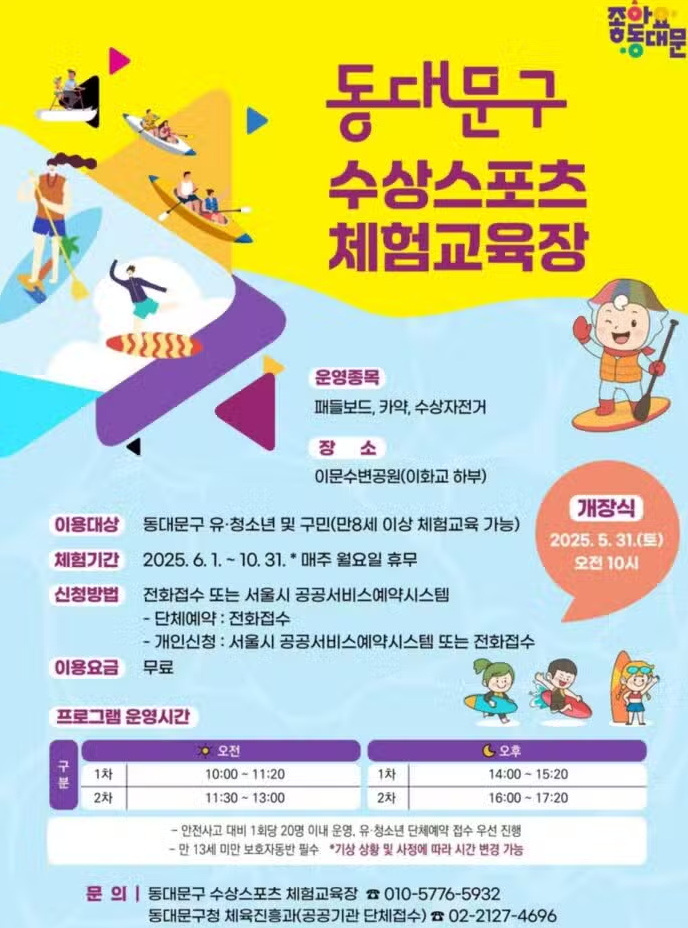 2025년 여름, 서울 동대문구는 도심 속에서 즐길 수 있는 안전하고 즐거운 수상스포츠 체험의 기회를 제공합니다.