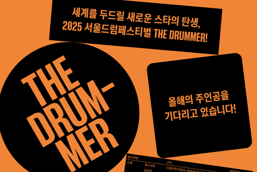 2025년에도 어김없이 서울드럼페스티벌이 찾아옵니다. 이 축제의 하이라이트라고 할 수 있는 ‘더 드러머(The Drummer)’ 경연대회가 열리는데요. 전 세계 누구나 도전할 수 있는 오픈 경연이니, 여러분의 실력을 마음껏 뽐낼 수 있는 기회입니다.