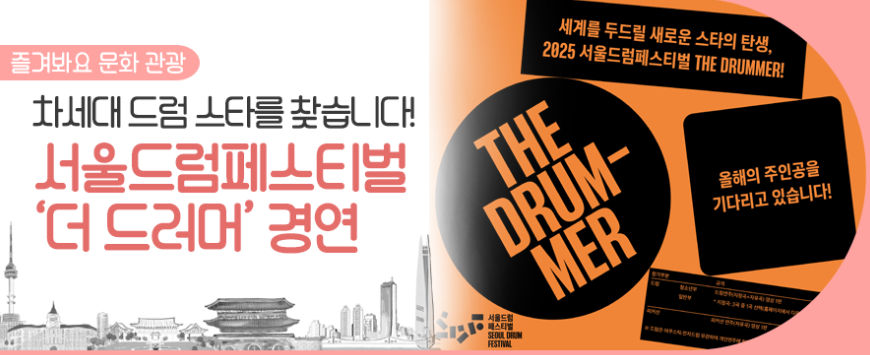 2025년에도 어김없이 서울드럼페스티벌이 찾아옵니다. 이 축제의 하이라이트라고 할 수 있는 ‘더 드러머(The Drummer)’ 경연대회가 열리는데요. 전 세계 누구나 도전할 수 있는 오픈 경연이니, 여러분의 실력을 마음껏 뽐낼 수 있는 기회입니다.