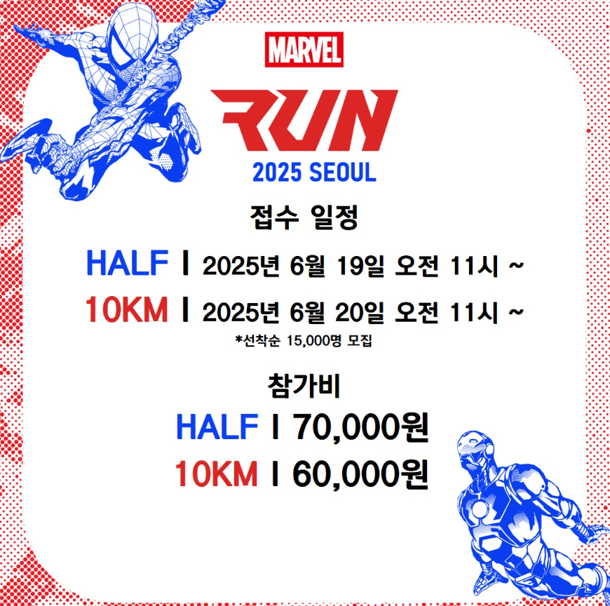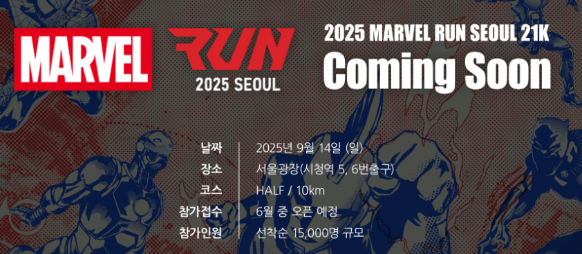 특히 이번 마블런은 하프 마라톤과 10km 코스로 나뉘어 운영되며, 선착순 마감이기 때문에 신청 타이밍이 곧 참가권 확보의 핵심이 됩니다. 본 포스팅에서는 마블런 2025 접수 일정, 참가 요령, 개최 장소, 그리고 현장 분위기까지 한눈에 파악할 수 있는 정보를 소개해드리겠습니다.