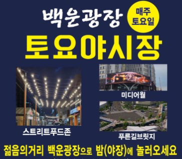 • 광주광역시 남구에 위치한 백운광장에서는 매주 토요일마다 차 없는 거리로 변모하여 '토요 야시장'을 즐길 수 있습니다. 이 야시장은 최근 개장하여 많은 이들의 관심을 끌고 있으며, 향후에도 토요일 오후 6시부터 11시까지 운영될 예정입니다.