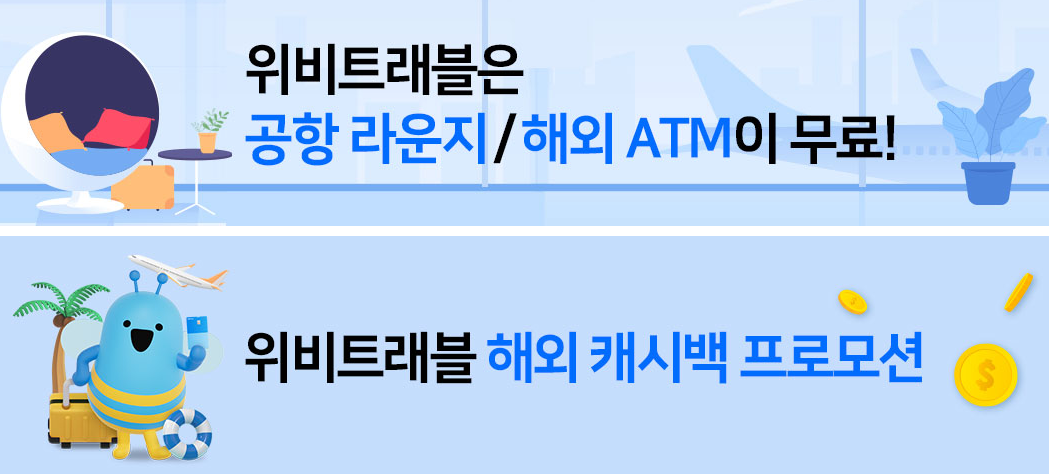 - '위비트래블 체크카드'는 해외 결제 수수료와 해외 ATM 출금 수수료가 모두 면제되어, 해외에서도 편리하게 사용할 수 있습니다. 이를 통해 여행 중의 금융적인 부담을 줄이고 여유로운 여행을 즐길 수 있습니다.