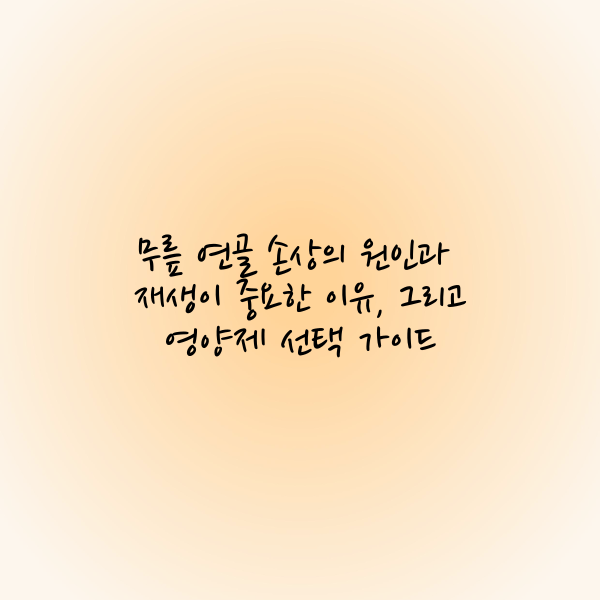 무릎 건강은 일상생활의 편안한 움직임과 활동을 유지하는 데 필수적입니다. 특히 무릎 연골 손상은 시간이 지날수록 큰 문제를 야기할 수 있는데요. 연골은 한 번 손상되면 자연적으로 회복되기 어렵기 때문에 조기 관리와 영양 보충이 매우 중요합니다. 이 글에서는 무릎 연골 손상의 주요 원인, 재생의 중요성, 그리고 올바른 영양제 선택 방법을 구체적으로 살펴보겠습니다.