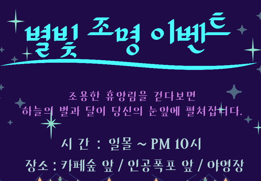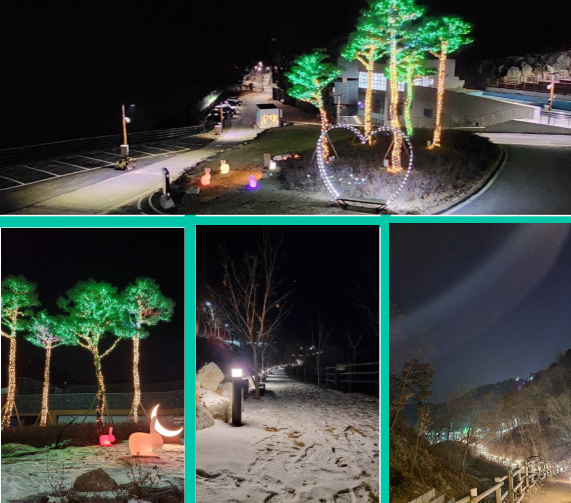 - 휴양림은 밤이 되면 별빛 조명으로 환상적인 분위기를 자아냅니다. 밤하늘을 배경으로 빛나는 조명 아래에서 가족, 연인, 친구와 특별한 시간을 보낼 수 있습니다.