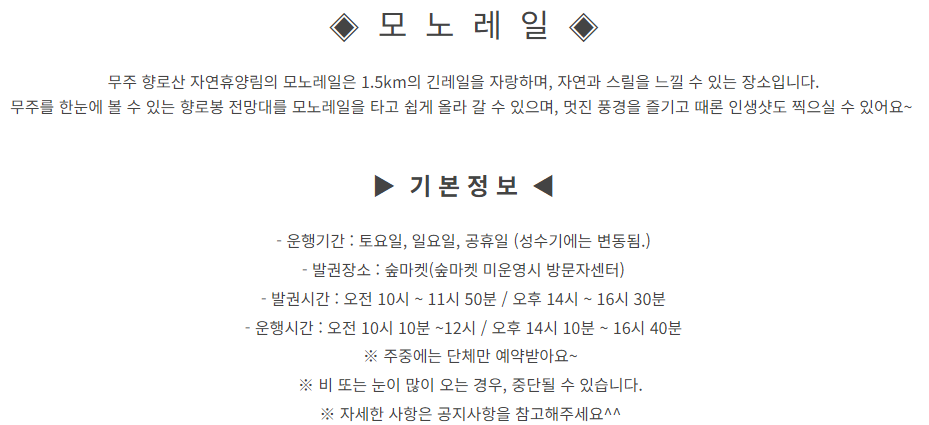 - 모노레일: 10:00~12:00 / 14:00~16:40 (발권 시간: 10:00~11:50 / 14:00~16:30)