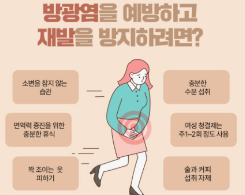 - 방광염은 초기에 적절히 관리하지 않으면 신우신염이나 만성 방광염으로 진행될 위험이 있습니다.
