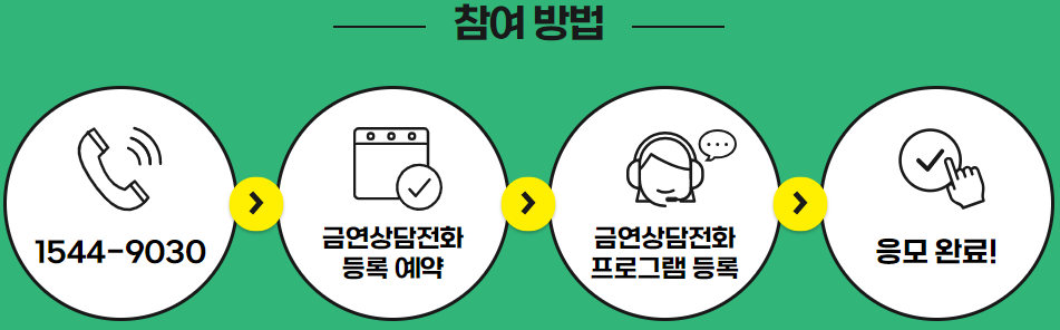 참여방법 : 1544 - 9030 → 금연상담전화 등록 예약 → 금연상담전화 프로그램 등록 → 응모 완료