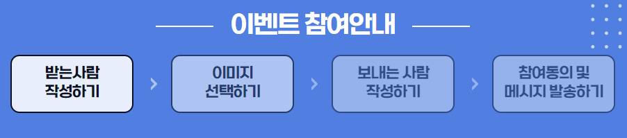 참여 방법 : 받는 사람 작성하기 → 이미지 선택하기 → 보내는 사람 작성하기 → 참여 동의 및 메시지 발송하기