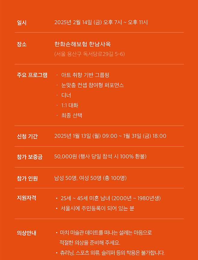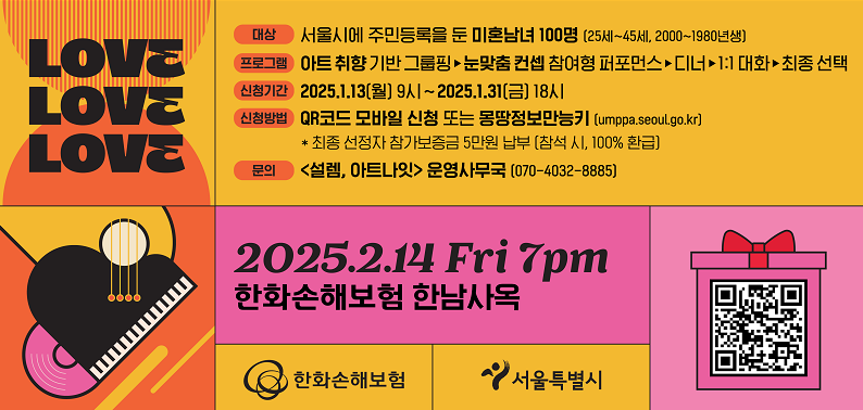 서울의 중심부에서 열리는 이번 행사는 사랑과 예술이 어우러지는 특별한 경험을 제공합니다. 발렌타인 데이 저녁에 진행되어 낭만적인 분위기 속에서 참가자들이 서로를 알아갈 수 있도록 다양한 프로그램이 준비되어 있습니다.