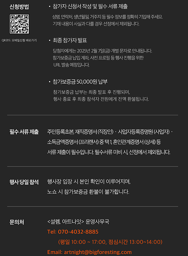 - 참가 보증금: 최종 선정자는 참가 보증금 5만 원을 납부해야 하며, 행사 후 100% 환불됩니다.