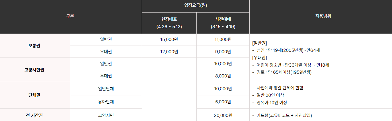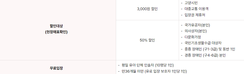 - ※ 고양시민 예매권, 얼리버드 입장권 등 할인권은 제외됩니다.