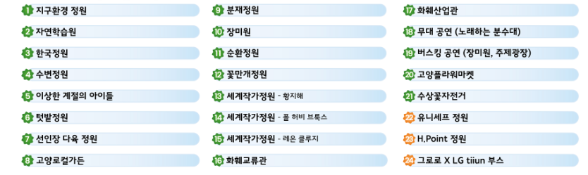 - 고양 꽃 박람회는 자연의 아름다움을 경험하고 즐길 수 있는 다양한 테마별 정원으로 구성되어 있습니다. 꽃만개정원, 텃밭정원, 장미원, 세계작가정원 등 다채로운 테마로 구성된 이 정원들은 참가자들에게 아름다운 꽃들을 감상하고 자연 속에서 힐링과 쉼을 찾을 수 있는 특별한 공간을 제공합니다.