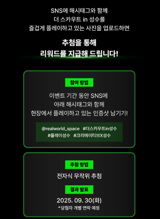 단 일주일간만 운영되는 만큼, 기회를 놓치지 말고 꼭 참여해 보시길 추천드립니다. 성수동에서 잊지 못할 하루를 보내고 싶다면, 답은 이미 정해져 있습니다. 바로 〈더 스카우트 in 성수〉!