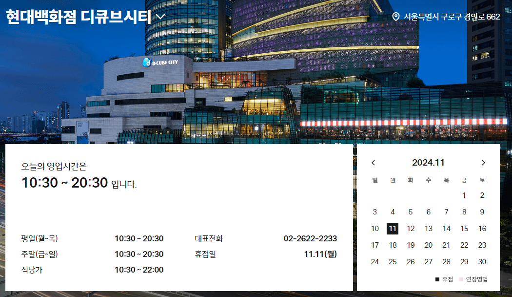 - 주소: 서울특별시 구로구 경인로 662, 현대백화점 디큐브시티