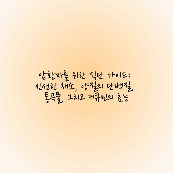 암 치료는 단순히 의학적 처치로 끝나지 않습니다. 암환자들에게 적절한 영양 섭취는 치료 효과를 극대화하고 부작용을 최소화하는 데 중요한 역할을 합니다. 이 글에서는 암환자 식단에 포함해야 할 주요 음식군인 신선한 채소와 과일, 양질의 단백질, 통곡물과 견과류, 그리고 강황에서 추출한 커큐민의 효능을 중심으로 식단 구성과 활용법을 자세히 소개하겠습니다.