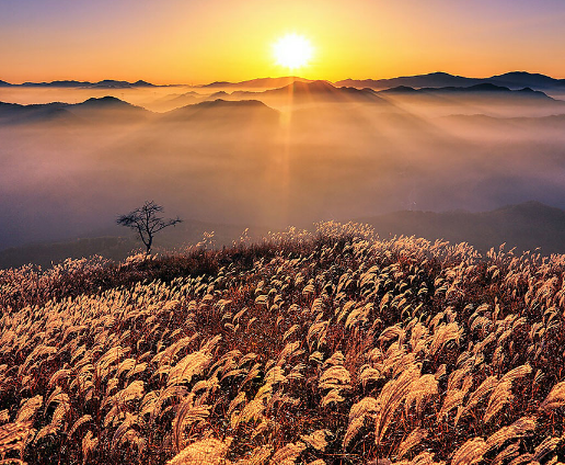 정선 민둥산은 산 정상에 나무가 없어 독특한 매력을 가진 산입니다. 이곳의 정상과 능선 일대는 매년 가을이 되면 대규모 억새밭이 형성됩니다. 산나물이 많이 나게 하려고 매년 한 번씩 불을 질렀던 것이 억새가 자라나기 시작한 배경입니다.