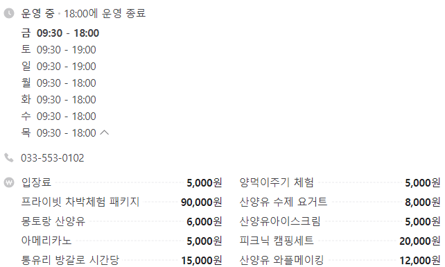 - 입장료: 5,000원 / 양 먹이주기 체험 5,000원