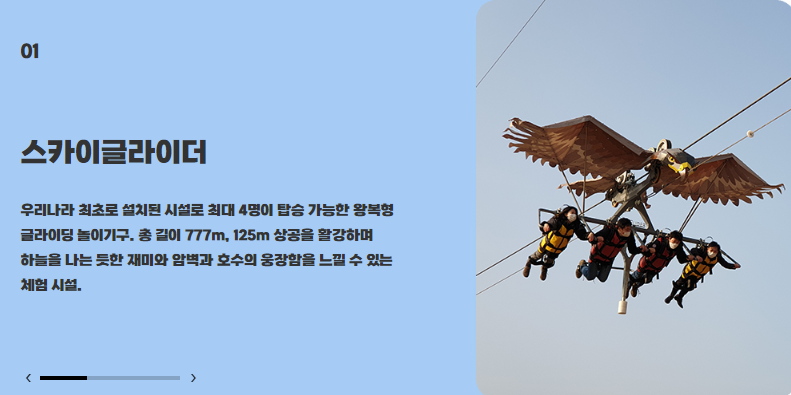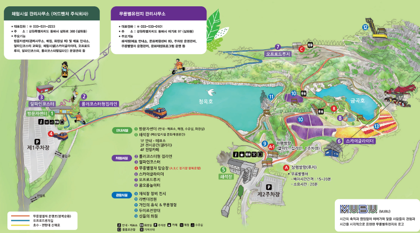 동해 무릉별유천지에서는 자연에 둘러싸여 즐길 수 있는 다양한 액티비티도 마련되어 있습니다. 125m 상공을 활강하는 스카이글라이더, 산속 레일을 빠르게 내려오는 알파인 코스터, 그리고 총길이 300m의 짧지만 강력한 스릴을 선사하는 집라인 등 아찔한 액티비티 시설이 운영되고 있어 온 가족이 함께 즐기기 좋은 장소입니다.