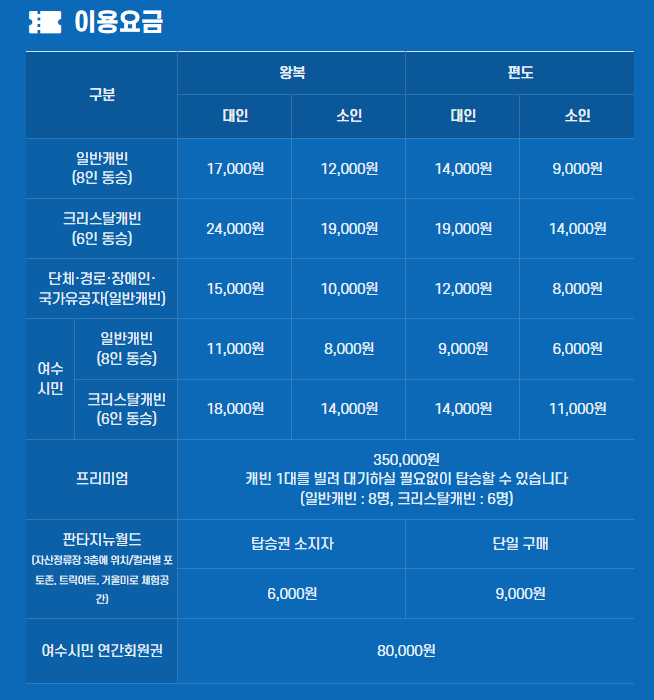 - 단, 가격이 저렴하지 않은 편이므로 예산에 부담이 되신다면 다음 기회를 노리는 것도 좋습니다. 비용 부담이 크다면 크리스탈 케빈보다는 일반 케빈을 이용하는 것도 좋은 방법입니다. 여수 해상 케이블카는 여수 여행의 하이라이트가 될 것이며, 하늘에서 바라보는 여수의 절경은 잊지 못할 추억을 선사할 것입니다.