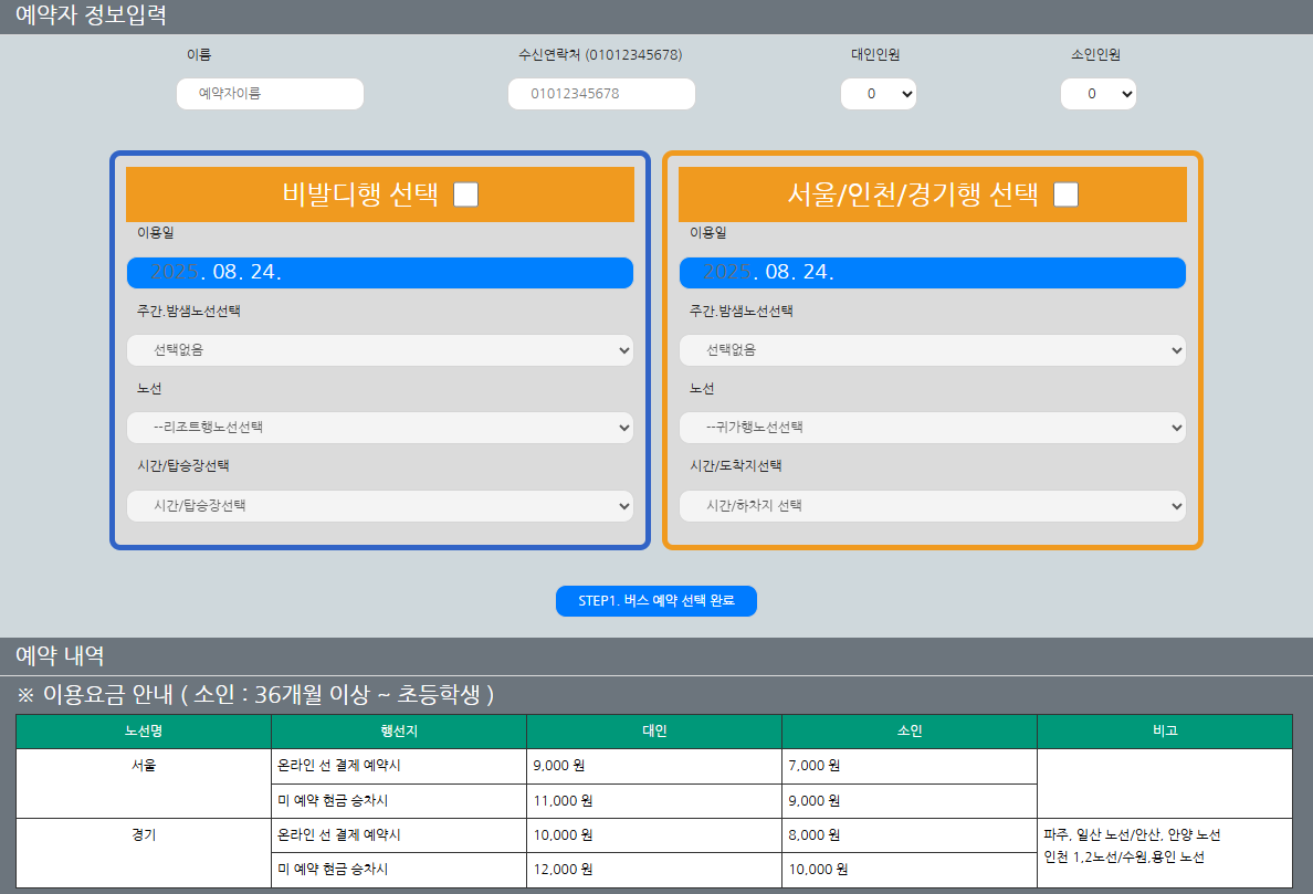 - 선착순 좌석 선택 → 출발 10~15분 전에 도착해야 원하는 자리에 앉을 수 있습니다.