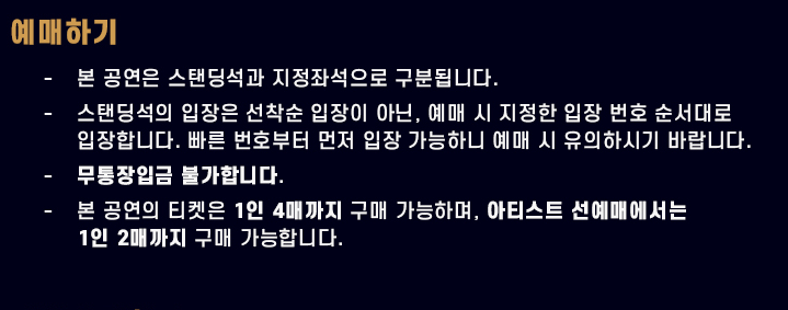 - 티켓 매진 가능성이 높으니 예매 시작 시간보다 10분 전에 대기 화면에 진입해 대기열에 참여하는 것이 유리합니다.