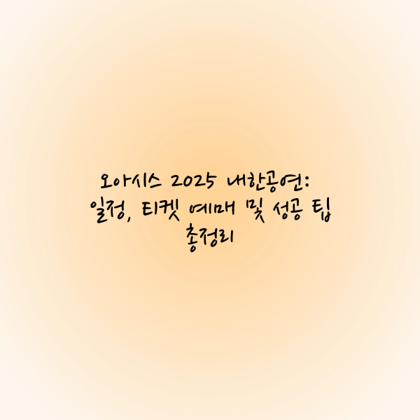 2025년 오아시스의 내한공연은 오랜 시간 기다려온 팬들에게 잊을 수 없는 추억을 선사할 것입니다. 티켓 예매는 경쟁이 치열할 것으로 예상되므로, 사전 준비를 철저히 하고 예매 팁을 활용해 성공적인 티켓팅을 이루시길 바랍니다.