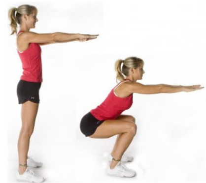 양손의 적정 무게의 아령을 들고 의자에 앉는 자세로 앉았다 일어나기를 반복하며 무릎이 엄지발가락 앞으로 나가지 않도록 주의합니다.