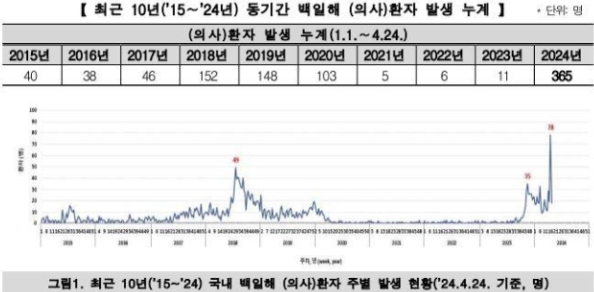 올해 들어 어린이를 중심으로 발작성 기침을 보이는 백일해 환자가 전년도 대비 급증하고 있는 가운데, 보건당국이 백신 접종을 서둘러달라고 당부했다는 소식이 전해졌습니다. 질병관리청에 따르면, 올해 백일해 환자는 지난 24일 기준 365명으로, 전년도 같은 기간의 11명 대비 33.2배 늘었다고 밝혔습니다. 이는 최근 10년간 같은 기간 대비 최다 발생했다는 것입니다.