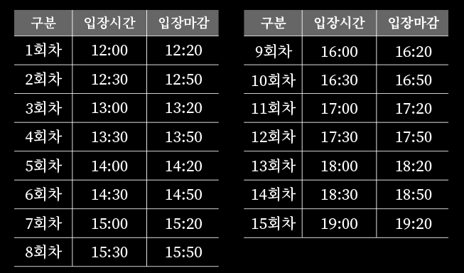 - 정해진 시간에 맞춰 입장하기 때문에, 지각 시 입장 제한될 수 있어요.