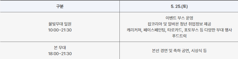 - 본선 공연은 25일 토요일 오전 10시부터 한강의 아름다운 물빛무대에서 펼쳐집니다. 이 특별한 날, 먹거리장터와 문화예술체험관, 포토존과 이벤트존 등 다양한 부대행사도 함께 진행될 예정입니다. 시민 여러분들은 본선 공연을 기다리는 동안 즐거운 시간을 보낼 수 있을 것입니다.