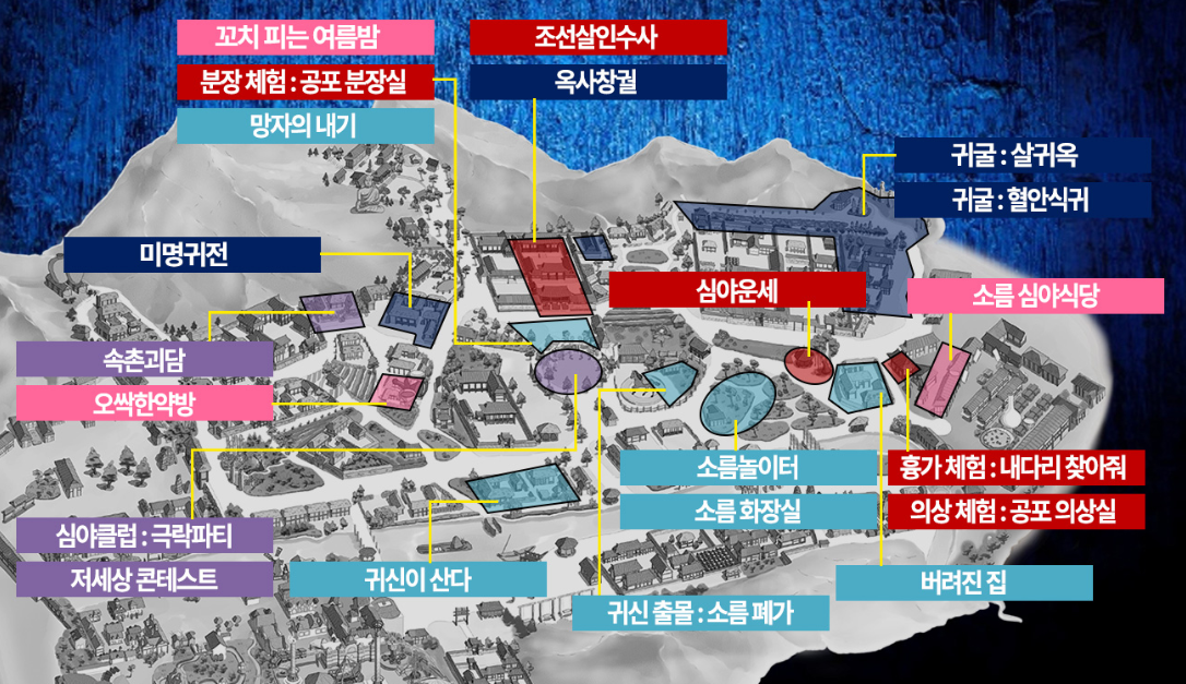 심야공포촌은 여름 한정으로 운영되는 한국민속촌의 야간 공포 축제입니다.