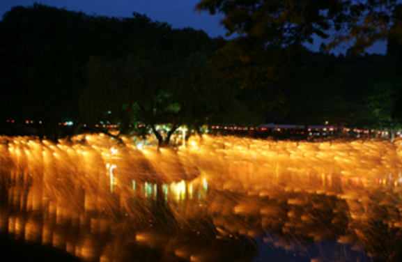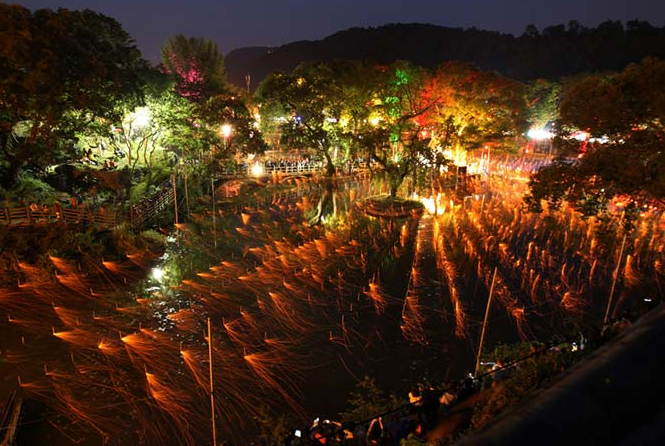 - 함안 낙화놀이는 숯과 한지로 만든 수천 개의 실을 줄에 매달고 불을 붙이는 전통 방식으로 진행됩니다. 저녁 무렵 불꽃이 타오르면서 환상적인 빛의 흐름이 연못 위로 흩날리는 장면을 연출합니다.