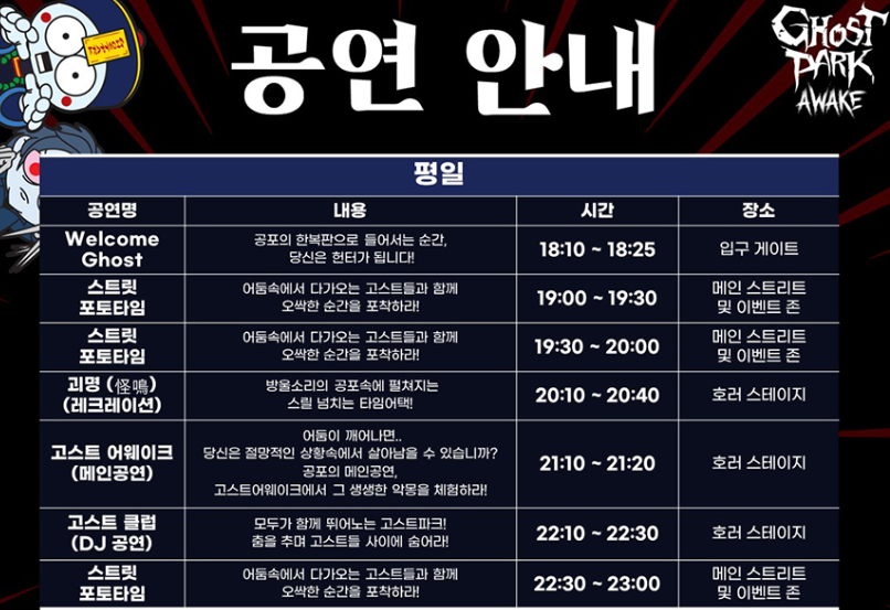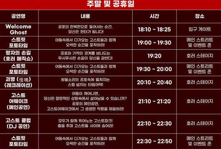 - 공연 내용: 다양한 호러 테마의 공연, 고스트들의 다채로운 연출
