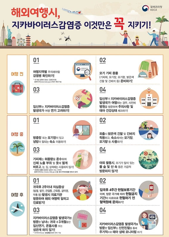 - 또한, 여행 후 4주간은 헌혈을 보류해야 하며, 지카바이러스 감염증 발생 국가를 방문한 경우에는 3개월간 임신을 연기하고 성접촉 시 콘돔을 사용하는 등의 조치를 취하는 것이 권장됩니다.