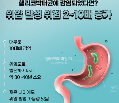 장기적인 헬리코박터균 감염은 위암 발생 위험을 높이는 요인 중 하나로 알려져 있습니다.