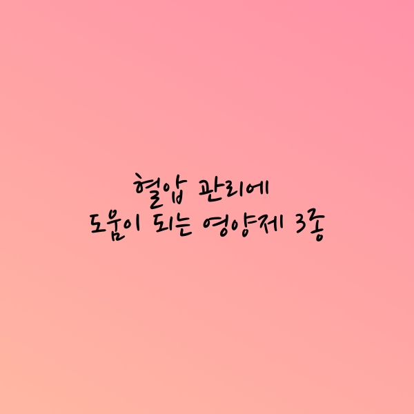 안녕하세요! 오늘은 혈압을 관리하는 데 도움이 될 수 있는 영양제 3종을 소개하려고 합니다. 먼저 말씀드리지만, 이 영양제들은 혈압약을 대신하는 것이 아니라 혈압 관리에 보조적으로 사용될 수 있습니다. 만약 혈압이 계속 높은 상태로 유지된다면 반드시 병원을 방문하여 전문가의 지도 아래 적절한 치료를 받아야 합니다.