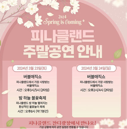 아산 피나클랜드는 '봄꽃 축제'와 함께 다채로운 프로그램을 준비하고 있으니, 토요일 하루동안 즐거운 시간을 보내고자 하는 분들에게 최적의 선택입니다. 함께 아름다운 봄날을 불꽃과 함께 만끽해보세요!