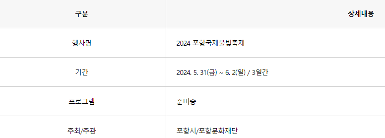 특히, 가장 화려한 볼거리가 펼쳐지는 날은 6월 1일 토요일이니, 방문 계획을 세우실 때 참고하시기 바랍니다. 함께 아름다운 불빛과 불꽃으로 가득한 포항의 여름밤을 만끽해보세요!