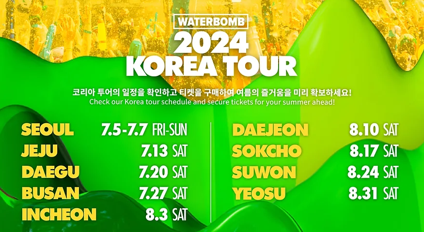- 매년 여름을 맞아 전국 각지에서 열리는 워터밤은 시원한 물놀이와 함께 다채로운 가수들의 공연을 즐길 수 있는 행사로, 많은 이들에게 사랑받는 대표적인 워터축제입니다. 특히 서울에서 개최되는 이번 워터밤은 다채로운 프로그램과 흥겨운 분위기로 여름의 열기를 싹~ 싹~ 날려줄 것으로 예상됩니다.