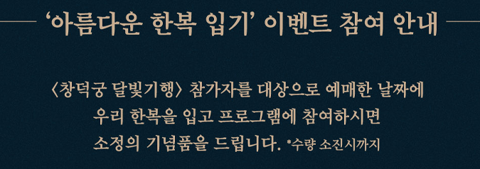 이번 2024 하반기 창덕궁 달빛기행에서는 한복을 입고 방문하는 관람객을 대상으로 특별한 이벤트가 준비되어 있습니다. 한복을 입고 참여하면 소정의 기념품이 제공되며, 창덕궁의 아름다운 배경과 어우러진 인생사진도 남길 수 있습니다. 특별한 날, 아름다운 한복과 함께 더 특별한 추억을 만들어 보세요.