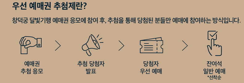 사전 예매는 08월 19일 오후 2시부터 08월 28일 오후 11시 59분까지 티켓링크 사이트에서 진행됩니다. 응모는 무료이며, 추첨을 통해 당첨된 사람만 예매할 수 있습니다. 추첨 결과는 08월 28일 오후 2시에 발표되며, 국가유산진흥원 누리집 및 티켓링크 회원정보에 기입된 휴대폰 번호로 개별 안내 문자 발송됩니다.