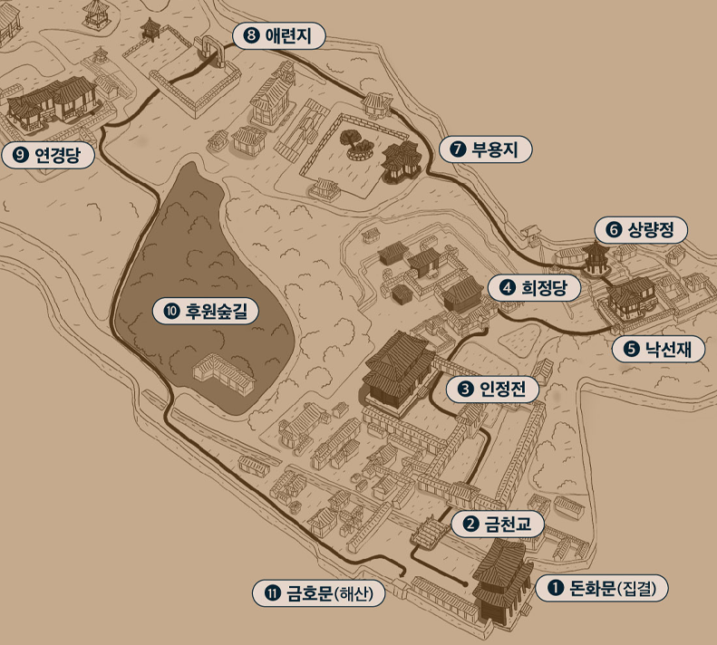 창덕궁 달빛기행은 정문인 돈화문에서 시작해 금천교, 인정전, 희정당, 낙선재, 상량정, 부용지, 애련지, 연경당, 후원숲길을 거쳐 금호문으로 이어지는 코스로 진행됩니다. 전문 해설사의 설명과 함께, 조선시대 궁궐의 정취를 깊이 느낄 수 있는 시간이 될 것입니다.
