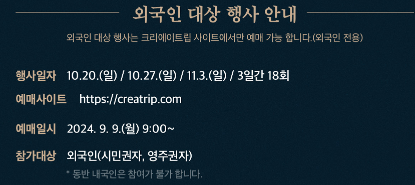 - 외국인 대상 행사는: 10월 20일, 10월 27일, 11월 3일 3일 동안 진행됩니다. 영어, 중어, 일어 해설이 제공되며, 티켓은 09월 09일 오전 9시부터 크리에이트립에서 예매할 수 있습니다.