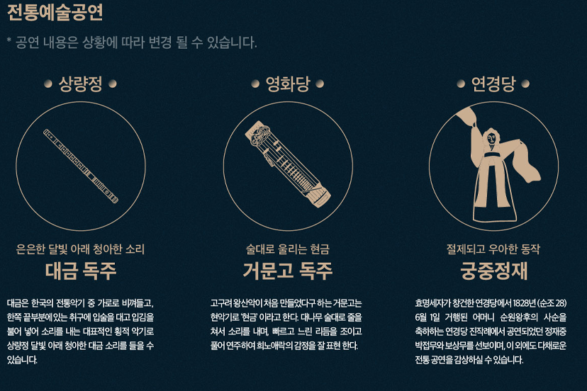 이번 창덕궁 달빛기행에서는 한국의 전통악기를 통해 조선시대의 소리를 경험할 수 있는 <대금 독주>와 <아쟁 산조> 공연이 펼쳐집니다. 청아한 대금 선율과 깊이 있는 아쟁의 음색이 어우러져, 관람객들에게 깊은 감동을 선사할 것입니다.